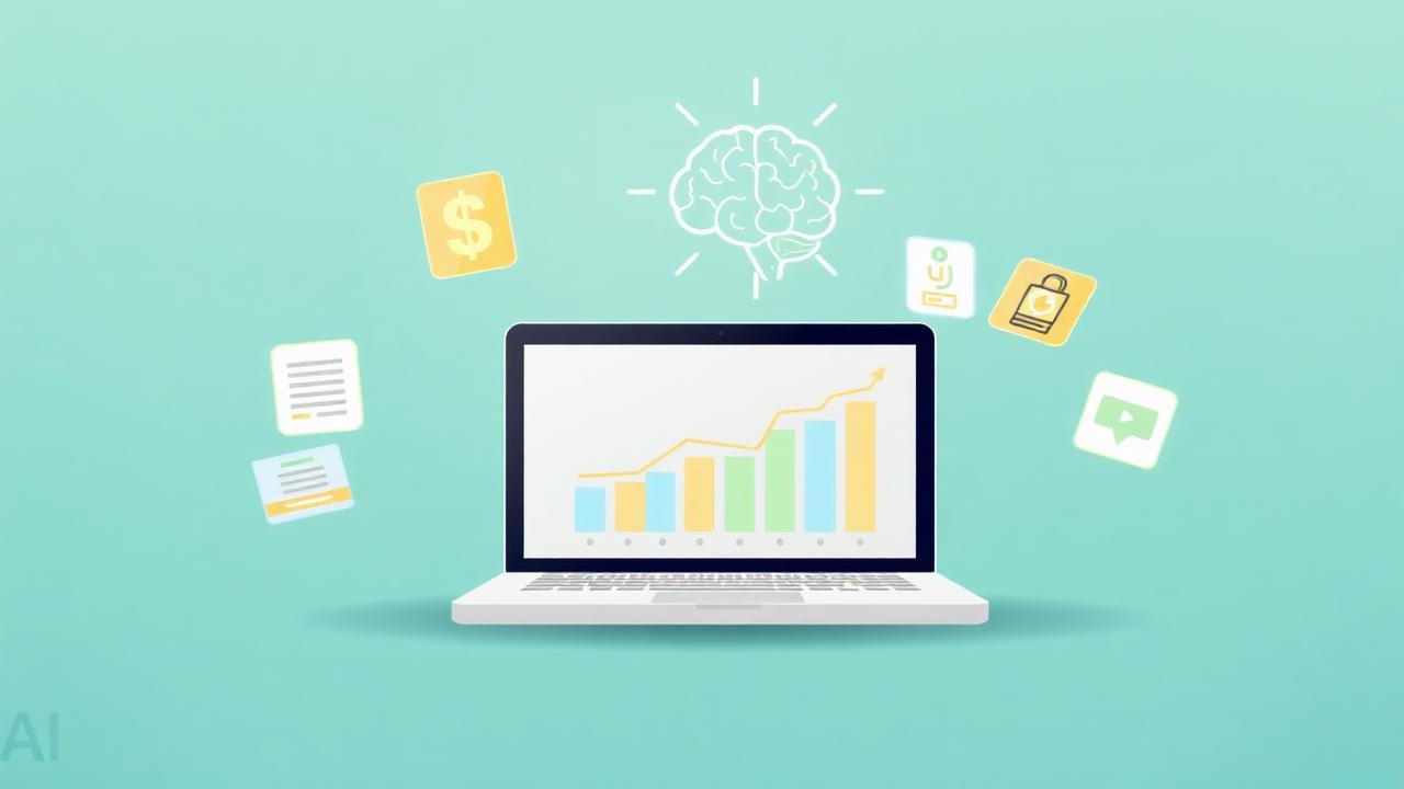 Illustration of a laptop with growth charts surrounded by icons for blogs, e-books, and video content, powered by an AI brain — symbolizing passive income built with AI